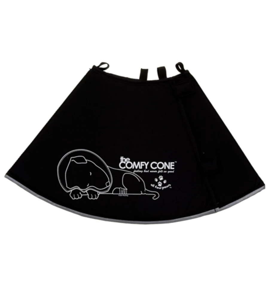 De Comfy Cone is een zachte comfortabele kegelvormige kraag voor honden en katten ter voorkoming van het likken en bijten aan helende wonden. De Comfy Cone is gemaakt van gelamineerd nylon over een stevige foamlaag. Hierdoor geeft deze kraag mee als het dieren ergens tegen aanloopt en voorkomt zo schade aan meubels en interieur. De kraag kan omgevouwen worden waardoor het mogelijk is voor het dier om te eten en drinken. De Comfy Cone is waterbestendig & – afstotend en is gemakkelijk vast te maken met de eigen halsband. Door middel van klittenband kan deze eenvoudig op maat gemaakt worden.