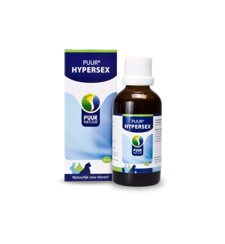 PUUR Hypersex is een voedingssupplement voor honden, katten, konijnen en paarden die last hebben van een hinderlijke geslachtsdrift. Daarnaast kan het ingezet worden ter ondersteuning van de prostaat.