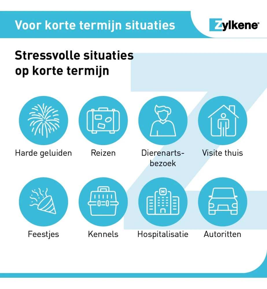 Zylkène is een hypoallergeen en lactosevrij voedingssupplement in de vorm van capsules voor honden en katten ter ondersteuning bij stressvolle situaties. Het middel bevat als werkzame stof het 100% natuurlijke alpha-casozepine. Dit is een melkeiwit dat zorgt voor een ontspannen gevoel zonder het dier suf te maken.